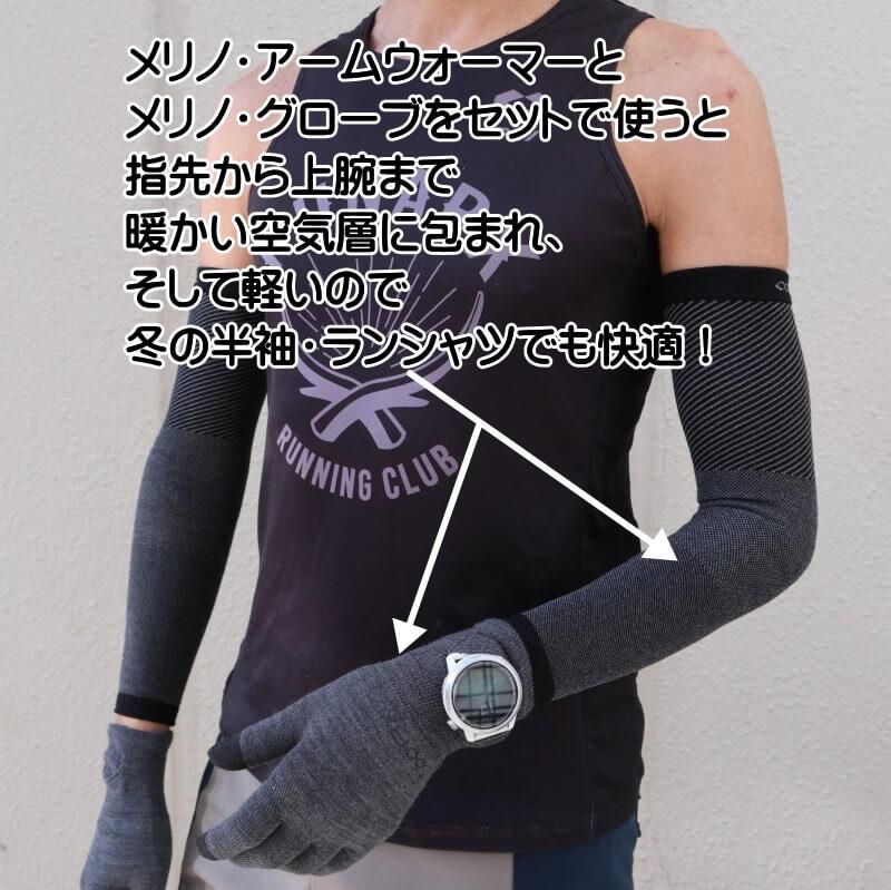 メリノ・グローブとセットで使うと、指先から上腕まで暖かい空気層に覆われ、冬の半袖やランシャツでのランニングでもとても快適です。