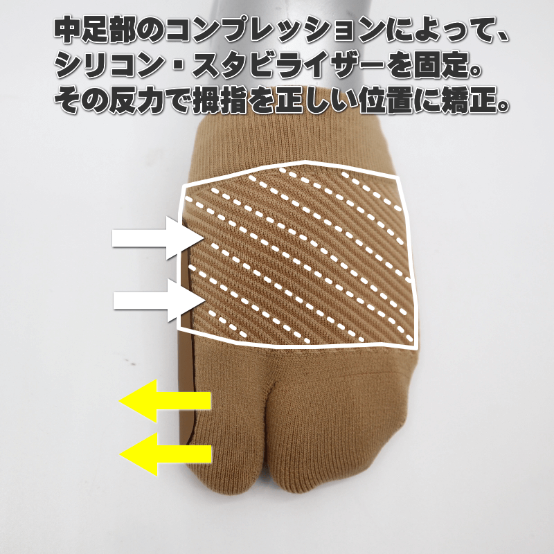 ●中足部のコンプレッションとシリコン製スタビライザーによって、拇指の位置を矯正