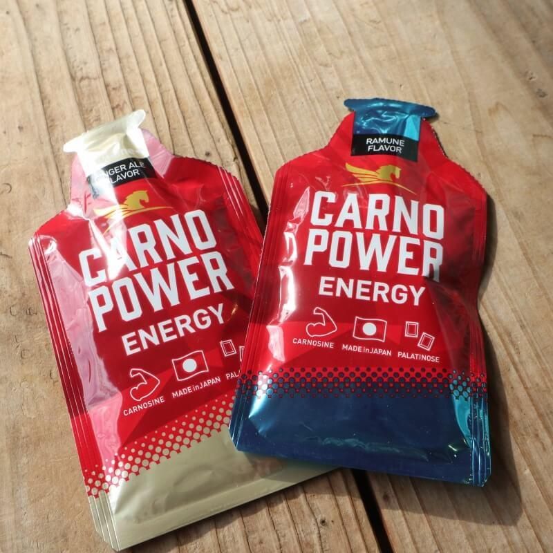 パフォーマンスをキープさせるために疲労回復させる抗酸化作用、疲労回復の効果がある「カルノシン」を50mg配合したエネルギー補給ジェル「カルノパワーエナジー」。液体タイプだから採りやすく、味はラムネとジンジャーエールを他にはないフレーバー