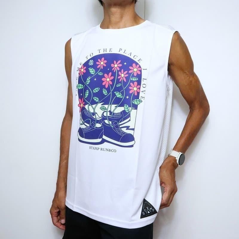 前面は吸汗速乾性に優れた高機能生地を、背面は通気性のいいメッシュ生地を採用して、サラッとした着心地のスリーブレス。グラフィックは生地の特性を損なわない「昇華プリント」で全面プリントしています。