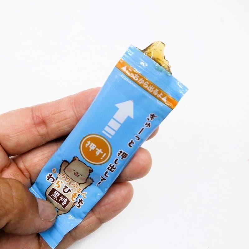 ぎゅっと押すとぷるぷるのわらびもちが出てくる手軽に食べられる「もっちりぷるんわらびもち」