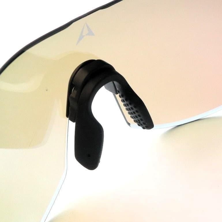 ・鼻の高さに合わせて調整可能なノーズパッドとシリコンテンプルラバーで激しい上下動でもズレないフィット感